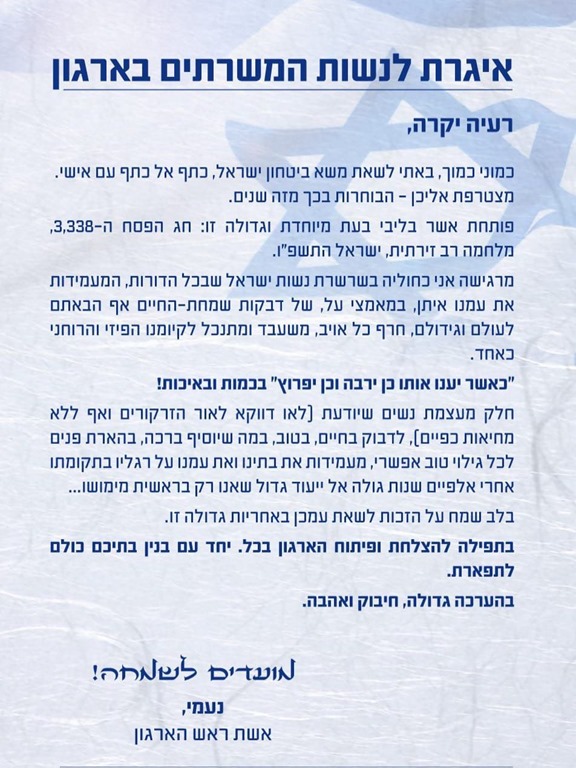 רוב התגובות שראיתי לפרסום האיגרת של נעמי זיני לבנות זוגן של משרתי השב"כ התרכזו בעיקר בפן המגדרי. במחיקת הנשים המשרתות, שהרי בני או בנות זוגן לא קיבלו איגרת מ"אשת ראש הארגון" כפי שחתמה עליה. ובתוכן המשיחי, הדוחק נשים לתפקידן המסורתי, המטריד מאוד.